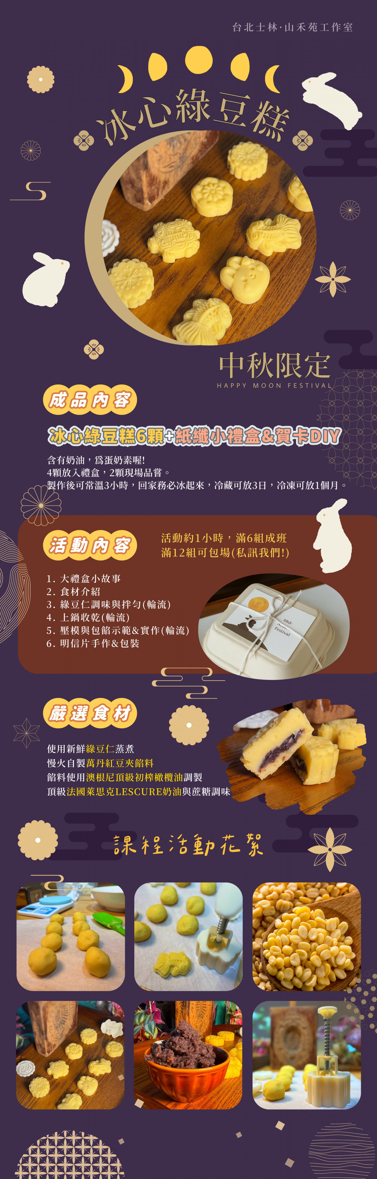 - 冰心綠豆糕製作:從調味拌勻、包餡、壓模,親手完成傳統工序